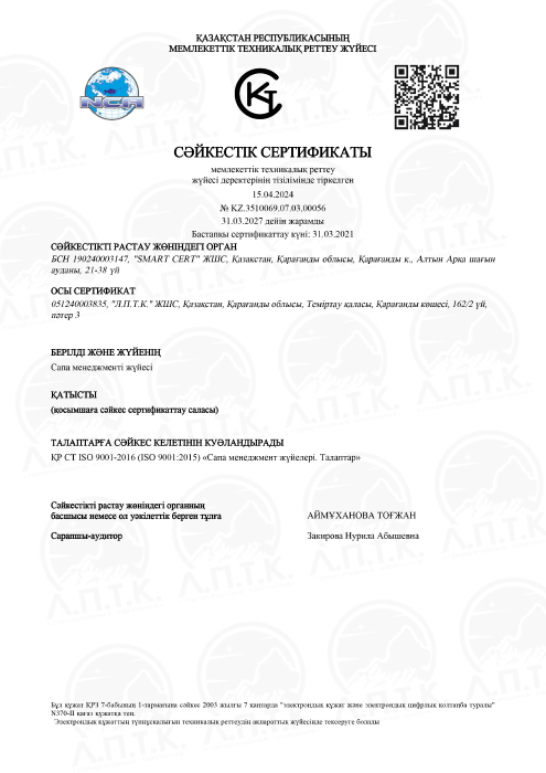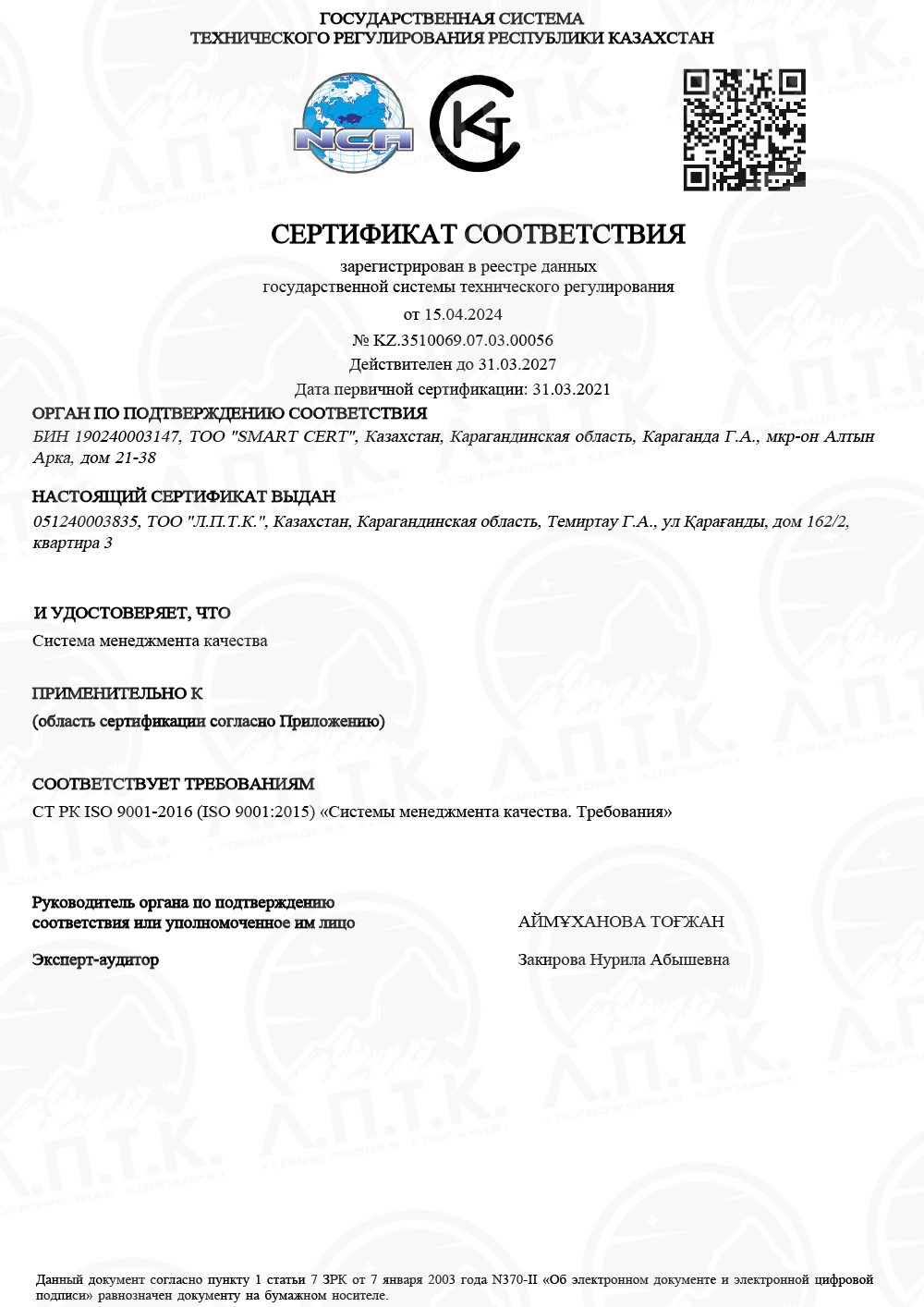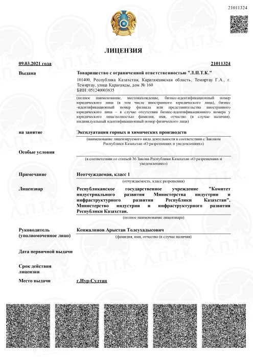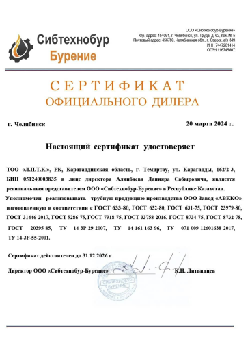 ТОО «Л.П.Т.К.», РК, Карагандинская область, г. Темиртау, ул. Караганды, 162/2-3, БИН 051240003835 в лице директора Алипбаева Данияра Сабыровича, является региональным представителем ООО «Сибтехнобур-Бурение» в Республике Казахстан