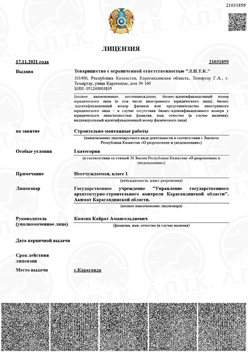 Компания ТОО «Л.П.Т.К.» предоставляет строительные услуги с 7 декабря 2005 года, является обладателем лицензии I категории на выполнение работ в области архитектурной, градостроительной и строительной деятельности на территории Республики Казахстан