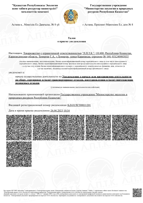 Уведомление о начале или прекращении деятельности по сбору, сортировке и (или) транспортировке отходов, восстановлению и (или) уничтожению неопасных отходов